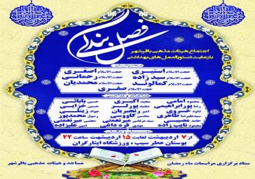 ستاد گرامیداشت ماه مبارک رمضان باقرشهر به مدت ۹ شب مراسم فصل بندگی را با مشارکت هیئات مذهبی برگزار می نماید.