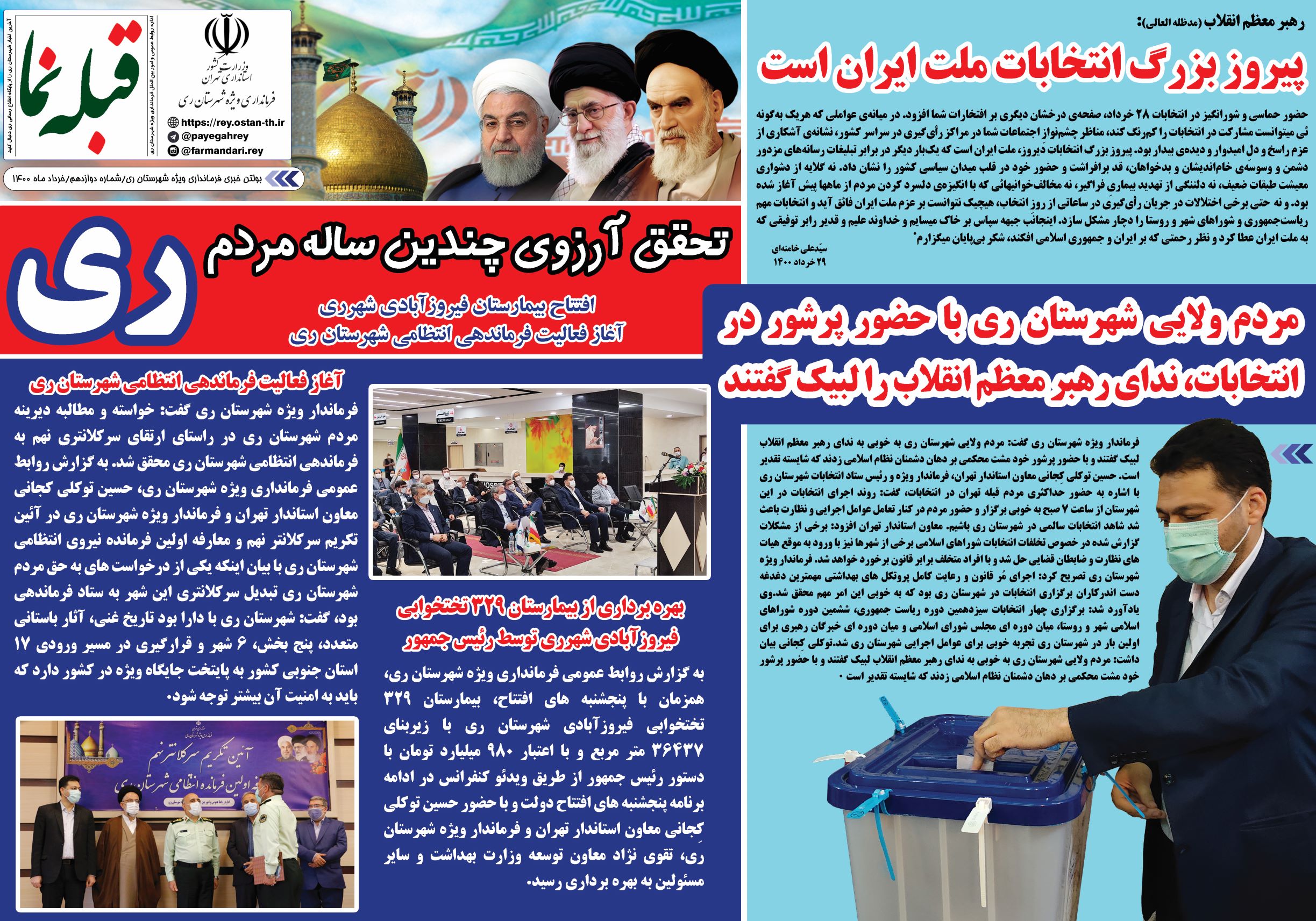 دوازدهمین شماره نشریه داخلی فرمانداری ویژه شهرستان ری "قبله نما" با انتشار اخباری از برگزاری انتخابات پرشور 28 خردادماه و تحقق مطالبات دیرینه مردم شهرستان ری منتشر شد.