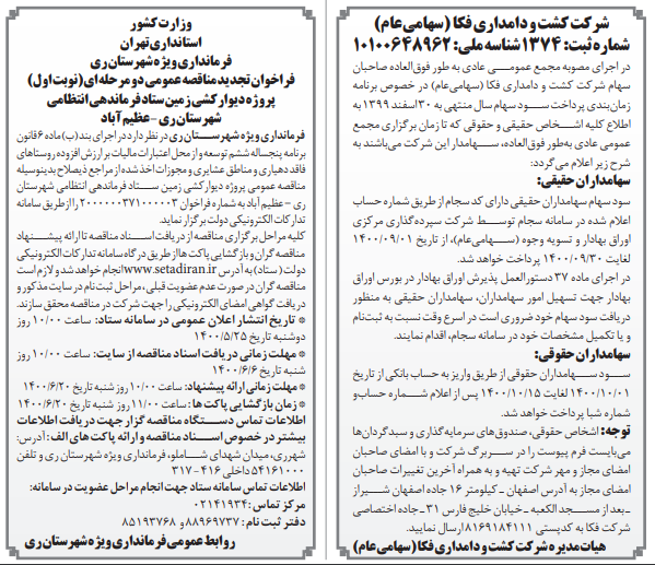 * تاریخ انتشار اعلان عمومی در سامانه ستاد: ساعت 10:00 روز دوشنبه تاریخ 1400/5/25
