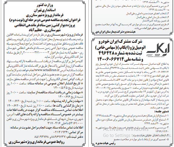 * تاریخ انتشار اعلان عمومی در سامانه ستاد:  ساعت 10:00 روز دوشنبه تاریخ 1400/5/25
