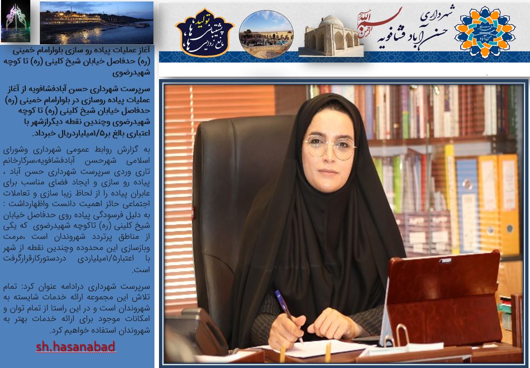 به گزارش روابط عمومی شهرداری وشورای اسلامی شهرحسن آبادفشافویه، تاری وردی سرپرست شهرداری حسن آباد ، پیاده رو سازی و ایجاد فضای مناسب برای عابران پیاده را از لحاظ زیبا سازی و تعاملات اجتماعی حائز اهمیت دانست واظهارداشت : به دلیل فرسودگی پیاده روی حدفاصل خیابان شیخ کلینی (ره) تاکوچه شهیدرضوی که یکی از مناطق پرتردد شهروندان است ،مرمت وبازسازی این محدوده وچندنقطه دیگرشهر با اعتبار1/5میلیاردی دردستورکارقرارگرفت است.