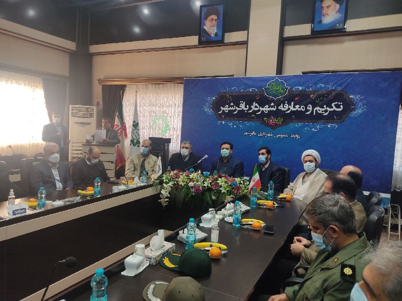 آئین تکریم و معارفه شهردار باقرشهر با حضور عابد ملکی سرپرست معاونت هماهنگی امور عمرانی استانداری تهران، حسین توکلی کِجانی معاون استاندار تهران و فرماندار ویژه شهرستان ری، محسن نایبی معاون امنیتی و انتظامی استانداری تهران، علی قشقایی مشاور استاندار و مدیرکل امنیتی و انتظامی استانداری تهران، معاون هماهنگی امور عمرانی فرمانداری ری، امام جمعه و بخشدار کهریزک، رئیس حوزه قضایی بخش کهریزک، مسئولین نظامی - انتظامی و امنیتی، خانواده معظم شهداء و ایثارگران و سایر مسئولین در محل شهرداری باقرشهر برگزار شد
